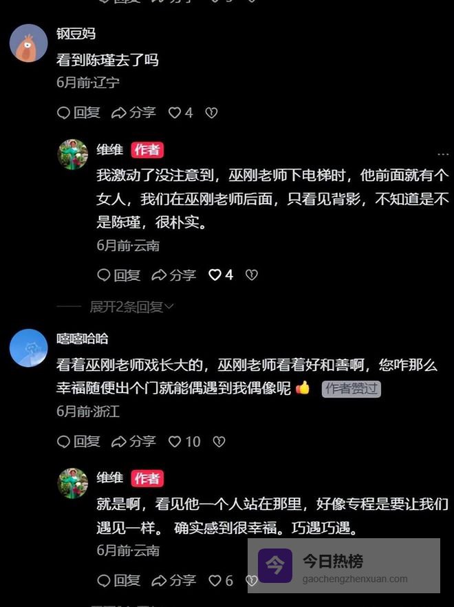 这已经不是两人第一次在昆明被偶遇了。今年1月底,就有开花店的店主说俩人一同到店里选花,去年9月也有网友在酒店大堂碰到过巫刚,夸他待人特别和善。
