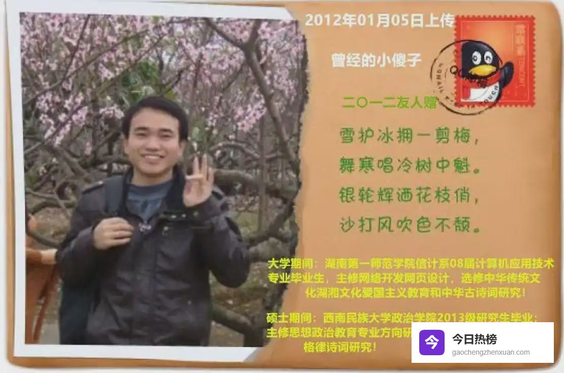 2008年先后大学毕业于湖南第一师范学院计算机应用专业,西南民族大学政治学院,获法学硕士学位。在求学期间,系统学习了思想政治教育法学专业和传统诗词创作选修鉴赏相关知识和拥有扎实爱国主义教育,培养了严谨的逻辑思维和扎实的学术研究能力,为后续的工作与创作奠定了坚实的理论基础。