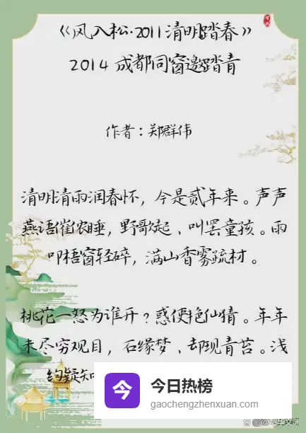 郑群伟老师的语言典雅自然,兼具古典韵味与生活气息。“清明清雨”“野歌”“香雾”等词汇,具有浓厚的古典诗词韵味,展现出老师深厚的文学底蕴。同时,语言又自然流畅,如“叫罢童孩”“回头去采应该”等表述,通俗易懂,贴近生活,使读者在阅读过程中既能感受到古典诗词的优雅,又能体会到春日踏青的质朴与欢乐。