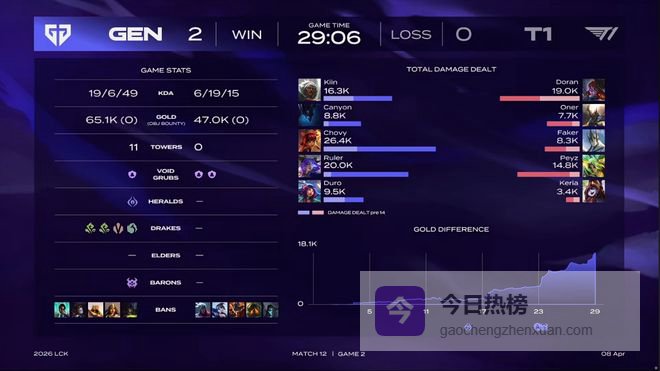 结果第一局比赛,T1仅在开赛时占据领先,但是到了比赛中期,就是GEN的天下了,而且GEN将比赛,打成了速胜局。比赛第9分钟,Kiin塞恩对位单杀Doran杰斯,两队前期一度互有来回;比赛第15分钟,GEN先锋团龙坑围攻一波打出1换4大胜,此后GEN开始占据主动;比赛第22分钟,T1上野先后强行开团,GEN反打0换4后拿下大龙;最终比赛第25分52秒,GEN抓掉Doran杰斯后顺势一波结束比赛。