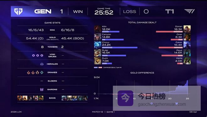 按照赛程安排,4月8日的对阵,将要把LOL Park给掀翻,由DK对阵HLE,T1大战GEN。在率先结束的第一场比赛中,HLE零封DK;那么接下来,就看GEN和T1能否战出精彩的对决了?他们谁能获胜,就让赛场来告诉我们吧