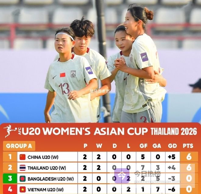 2轮战罢,中国U20女足和泰国U20女足都是2连胜提前出线。中国U20女足以1个净胜球优势力压泰国女足,暂列小组头名。
