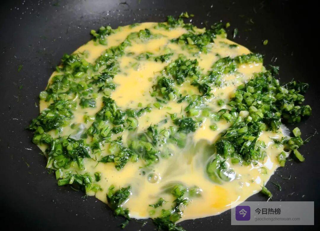 定型:茴香刚断生,表面撒盐翻匀,把蛋液均匀淋在菜面上,先别急着翻动。