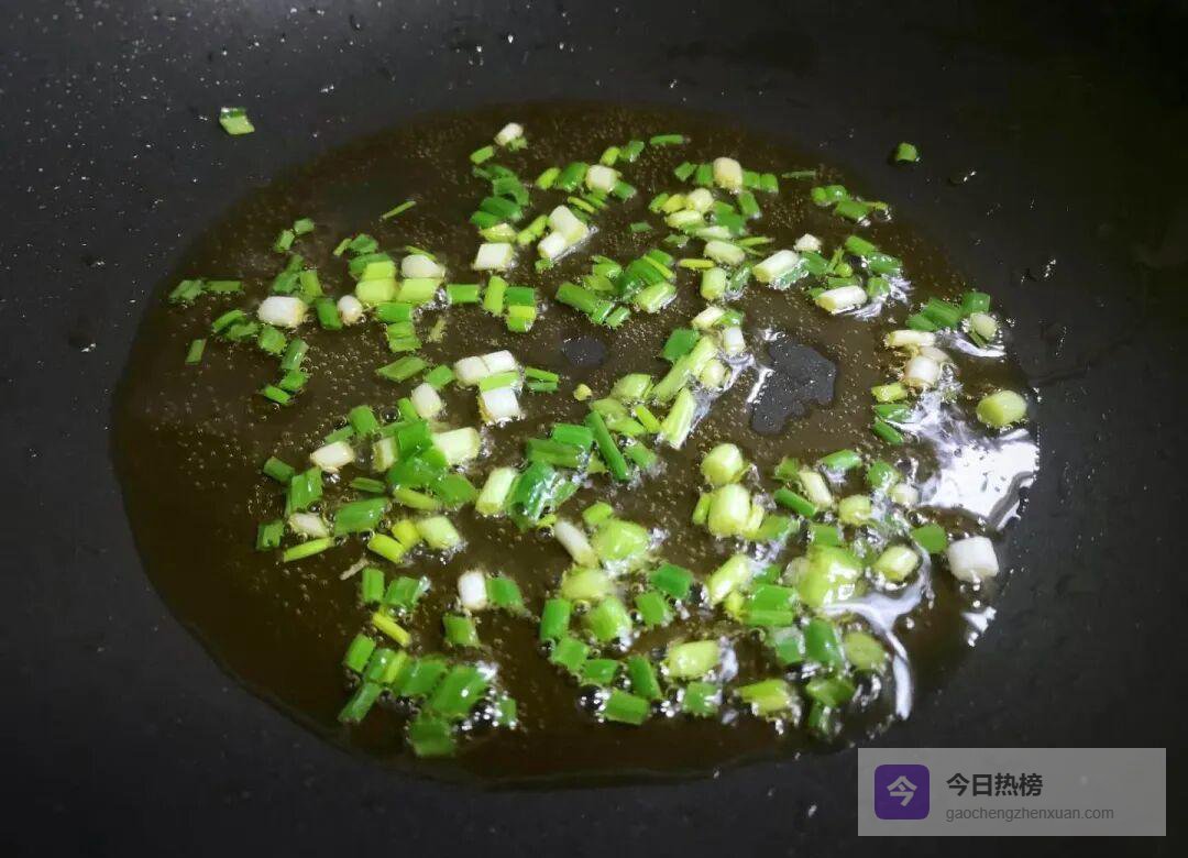 炝锅:热锅凉油,中小火下葱花,葱香一出立刻放茴香,大火快炒两下。