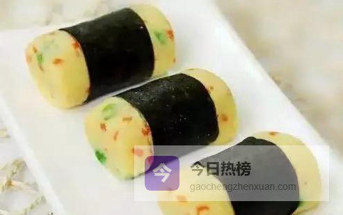 5.4 ◇ 土豆泥紫菜卷 土豆泥混胡萝卜、豌豆、蛋黄,用紫菜裹成“饭团”,低脂高纤的握寿司升级版,拍照发圈颜值在线。