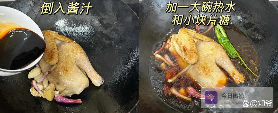 3.焖煮:锅中加入葱姜蒜+小半块片糖+调好的酱汁+1碗热水,大火煮沸,转小火焖煮20分钟,期间每隔5分钟翻下面,防止糊底。