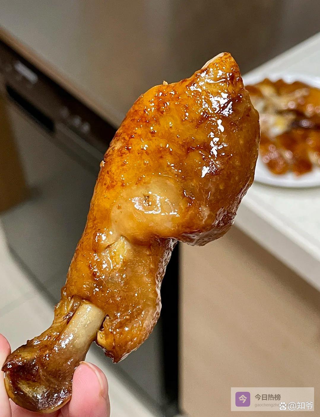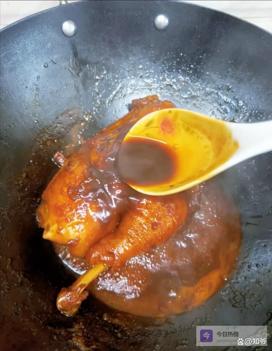 4.浇汁:最后转大火收汁,待汤汁收到浓稠,用锅铲多次浇到鸡皮上,直到鸡肉颜色红亮,关火焖15分钟,出锅先刷层蜂蜜水,颜色更亮。