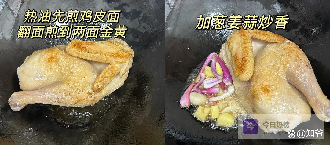 鸡烫好擦干水分,锅中下油,油热下鸡,煎至两面金黄微焦,加洋葱姜蒜爆香,鸡皮煎一下没有腥味哦。
