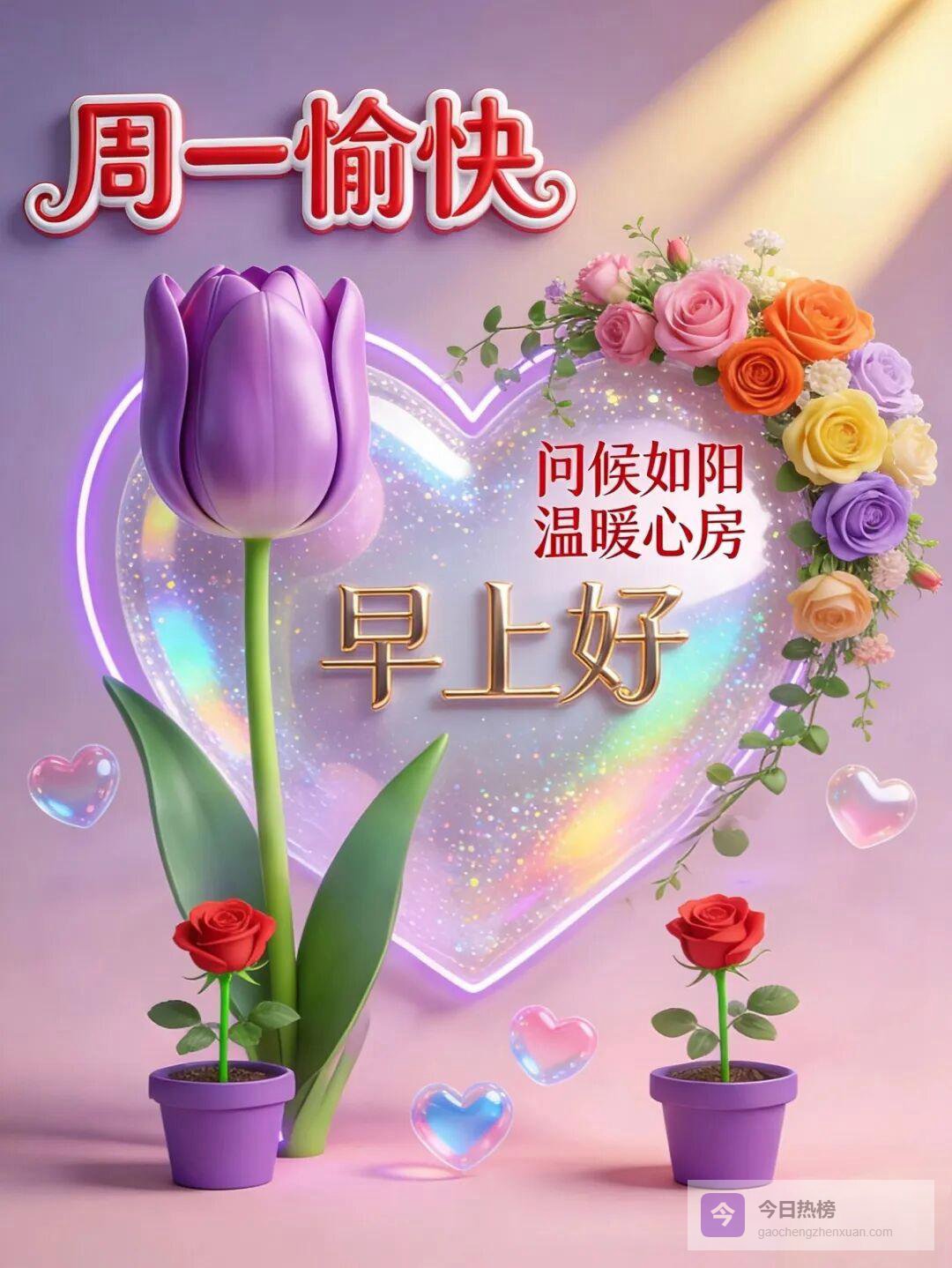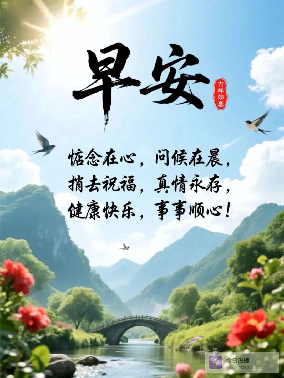 轻轻的问候,载去平安快乐;美美的心情,送去幸福安康;暖暖的情怀,带去如意吉祥;深深的祝福,捎去好运永恒。早上好!❤️☀️