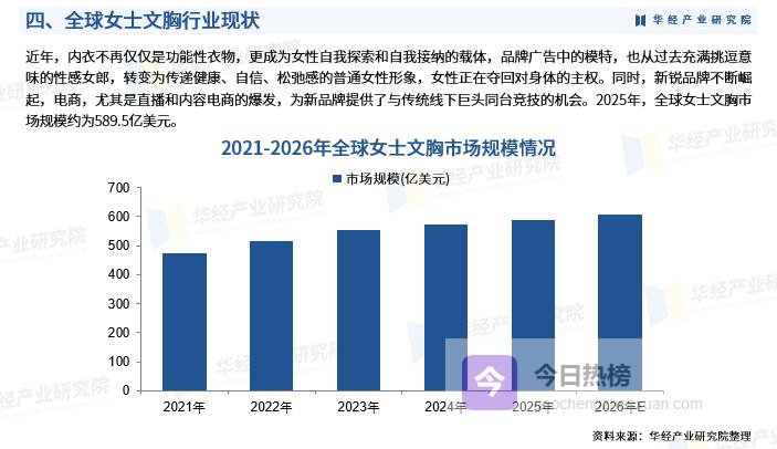 近年,内衣不再仅仅是功能性衣物,更成为女性自我探索和自我接纳的载体,品牌广告中的模特,也从过去充满挑逗意味的性感女郎,转变为传递健康、自信、松弛感的普通女性形象,女性正在夺回对身体的主权。同时,新锐品牌不断崛起,电商,尤其是直播和内容电商的爆发,为新品牌提供了与传统线下巨头同台竞技的机会。2025年,全球女士文胸市场规模约为589.5亿美元。