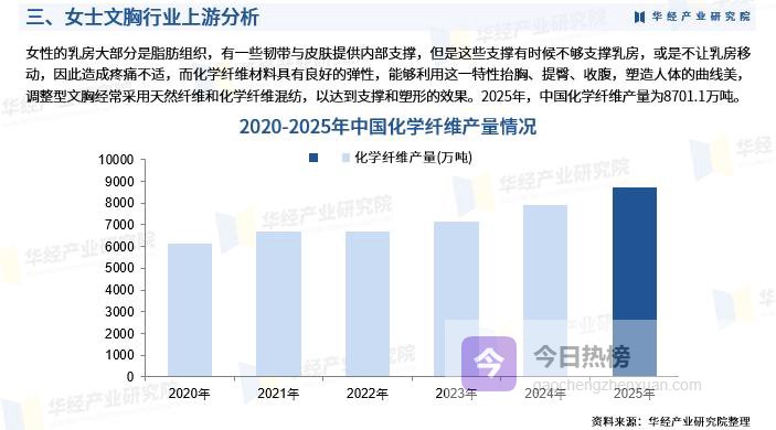 女性的乳房大部分是脂肪组织,有一些韧带与皮肤提供内部支撑,但是这些支撑有时候不够支撑乳房,或是不让乳房移动,因此造成疼痛不适,而化学纤维材料具有良好的弹性,能够利用这一特性抬胸、提臀、收腹,塑造人体的曲线美,调整型文胸经常采用天然纤维和化学纤维混纺,以达到支撑和塑形的效果。2025年,中国化学纤维产量为8701.1万吨。