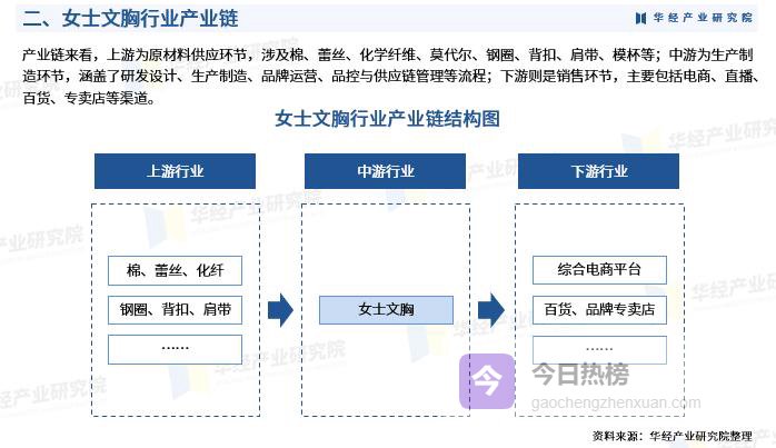 产业链来看,上游为原材料供应环节,涉及棉、蕾丝、化学纤维、莫代尔、钢圈、背扣、肩带、模杯等;中游为生产制造环节,涵盖了研发设计、生产制造、品牌运营、品控与供应链管理等流程;下游则是销售环节,主要包括电商、直播、百货、专卖店等渠道。