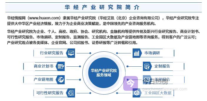 华经情报网隶属于华经产业研究院,专注大中华区产业经济情报及研究,目前主要提供的产品和服务包括传统及新兴行业研究、商业计划书、可行性研究、市场调研、专题报告、定制报告、工业园区大数据、产业链地图等。涵盖文化体育、物流旅游、健康养老、生物医药、能源化工、装备制造、汽车电子等领域,还深入研究智慧城市、智慧生活、智慧制造、新能源、新材料、新消费、新金融、人工智能、“互联网+”等新兴领域。