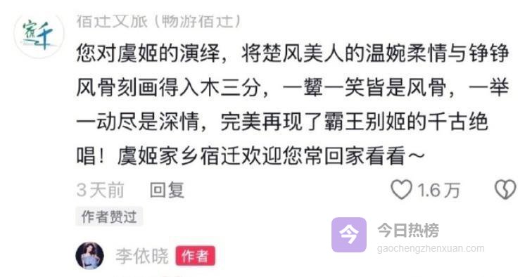 剧中虞姬的扮演者李依晓,也收到了宿迁文旅的邀请。 李依晓本人在相关内容的评论区回复了“期待”二字。 宿迁文旅方面表示,与李依晓的对接联系也在进行中。 她很可能出现在宿迁队后续的某个主场比赛现场。