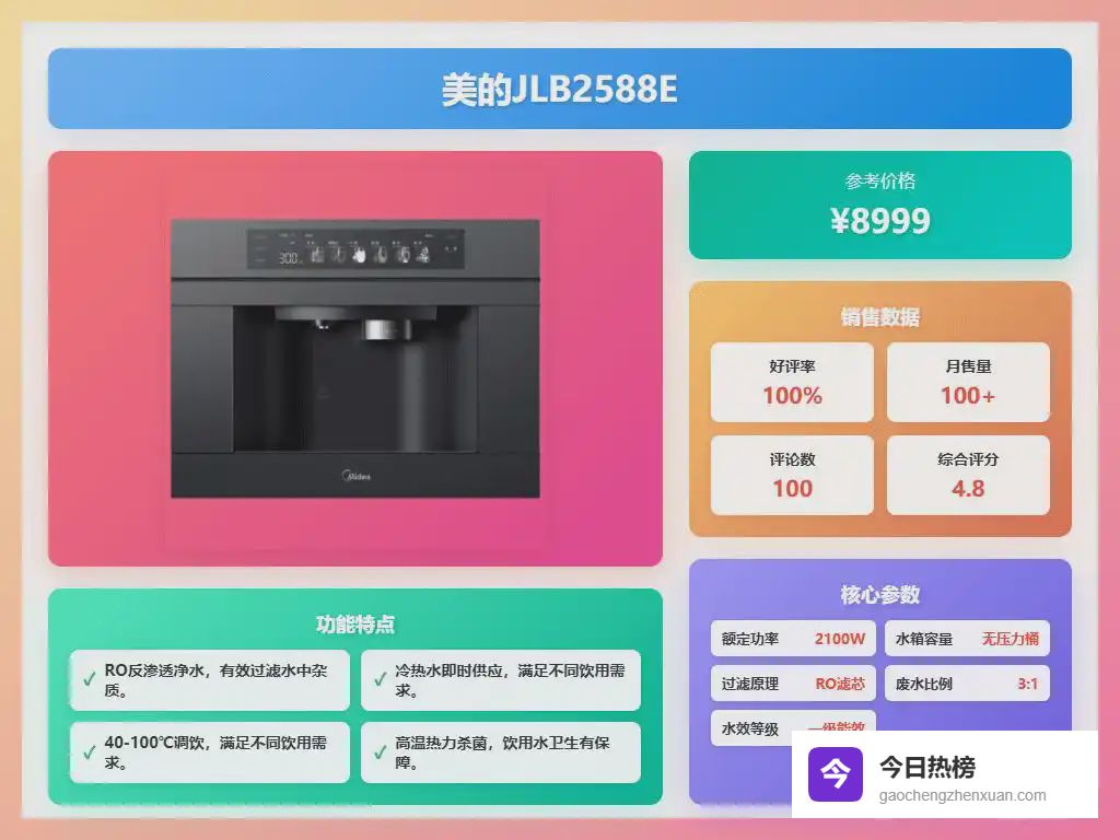 当然,除了净水效果,使用方便也很重要。现在很多美的净水器都带有智能功能,比如实时监测水质、APP远程控制等等,用起来更省心。如果你家厨房空间比较紧张,可以考虑美的JLB2588E这种嵌入式净水器,不占地方,还美观。还有,换滤芯的频率和成本也要考虑进去,尽量选那些长效滤芯的,能省不少事儿。总之,选购的时候要综合考虑净水效果、使用便捷性、后期维护成本,才能选到真正适合自己的美的净水器!