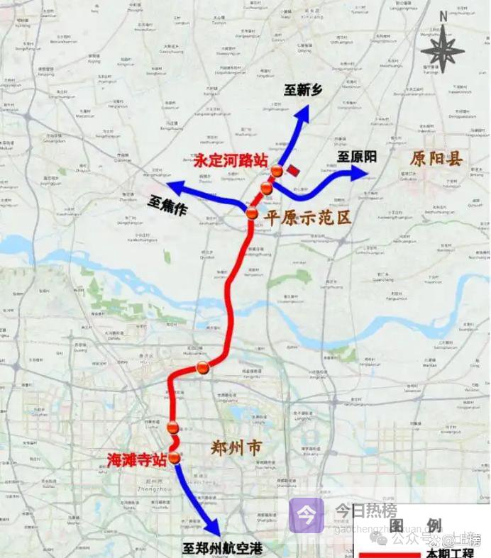 线路从中心城区海滩寺站出发,向北延伸至新乡平原新区,全长36.8公里(高架段26.32公里,地下段10.13公里),设站6座。建成后将打破黄河天堑,构建郑州与平原新区“半小时通勤圈”。