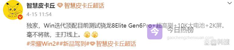 简单翻译一下,荣耀WIN2手机会用上未来最顶尖的处理器,就是骁龙8Elite Gen6Pro,另外荣耀WIN2的屏幕,是2K分辨率,还有超高刷。