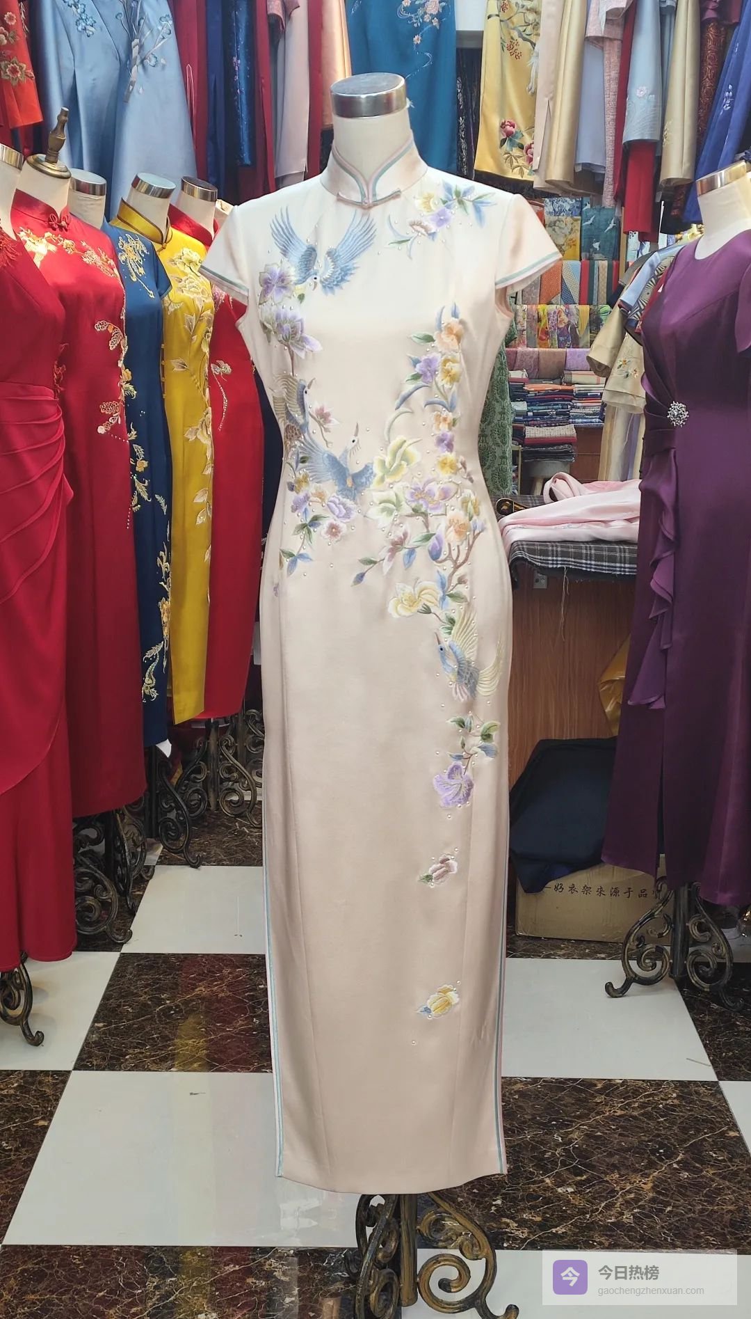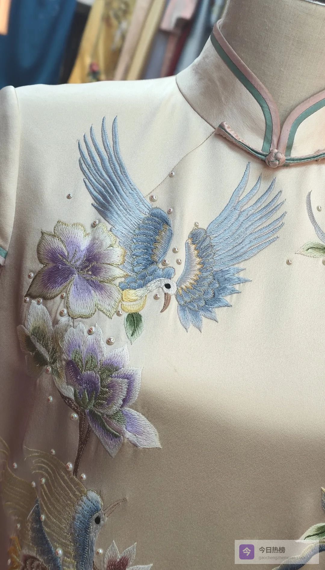 真丝缎手推绣旗袍,内衬同样真丝,花开富贵与开枝散叶的暗纹寓祝福于针脚;传统却不老气,妈妈穿上它就像走进民国电影。