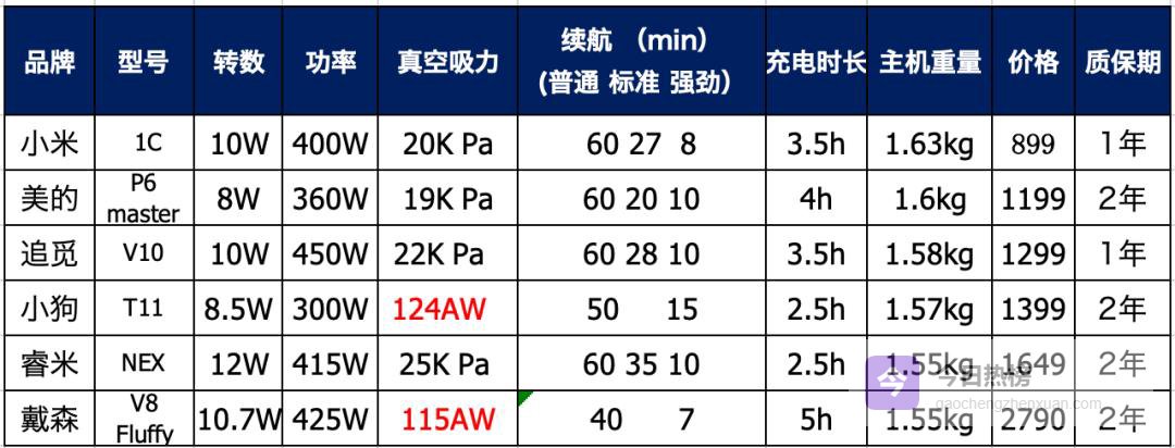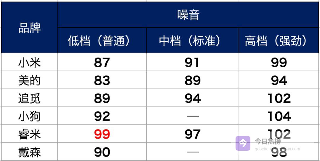 第一遍:睿米>戴森>美的>小米>小狗>追觅
