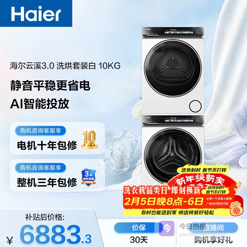 【京东自营】海尔云溪3.0滚筒洗烘套装10KG全自动洗衣机+热泵烘干机家用家电补贴京东自营583+5¥