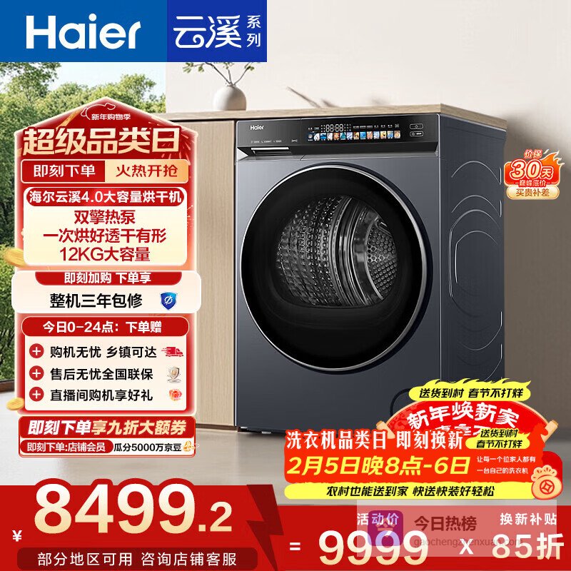 【京东自营】海尔云溪4.0双擎热泵全自动滚筒烘干机烘衣服干衣机12KG大容量AI家电补贴自营GA12¥