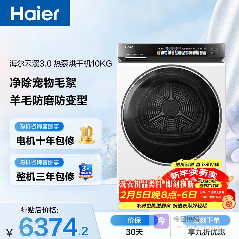 【京东自营】海尔云溪3.0全自动滚筒烘干机烘衣服干衣机白色10KG双擎热泵家电补贴自营GA100-S¥