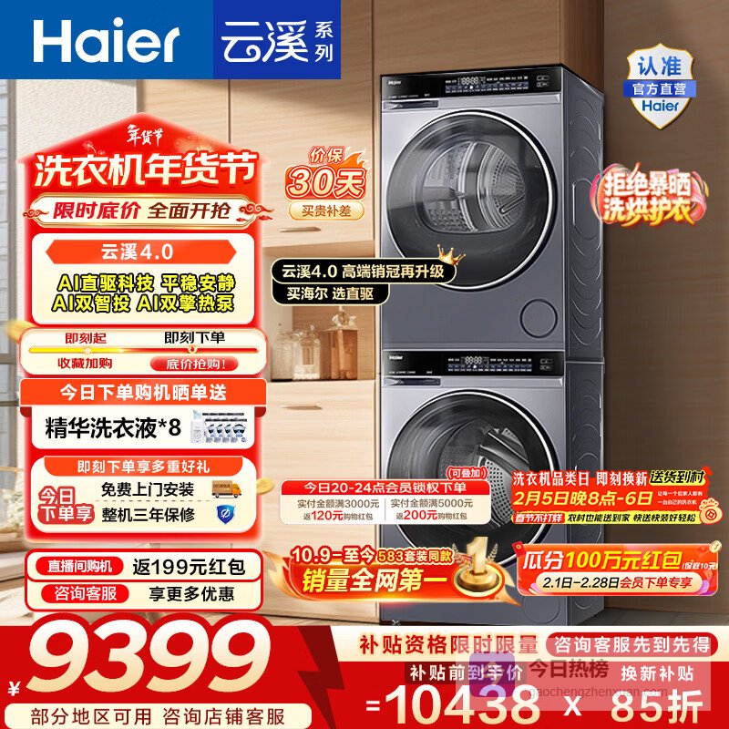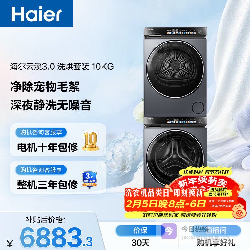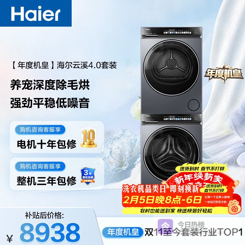 【京东自营】海尔年度机皇云溪4.0滚筒洗烘套装10KG洗衣机+双擎热泵烘干机家电补贴自营583+58¥