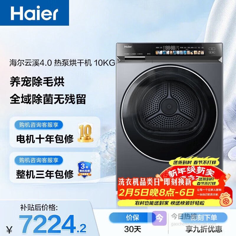 【京东自营】海尔云溪4.0双擎热泵全自动滚筒烘干机烘衣服干衣机10KG超薄京东自营GA100-STQ¥