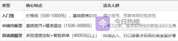最终建议:1. 预算2000元内:选中端均衡型,重点看直喷蒸汽和温控精度;2. 预算充足:直接上高端机型,体验蒸汽与烘烤的协同效果;3. 小户型:优先考虑台面机型,注意预留散热空间。