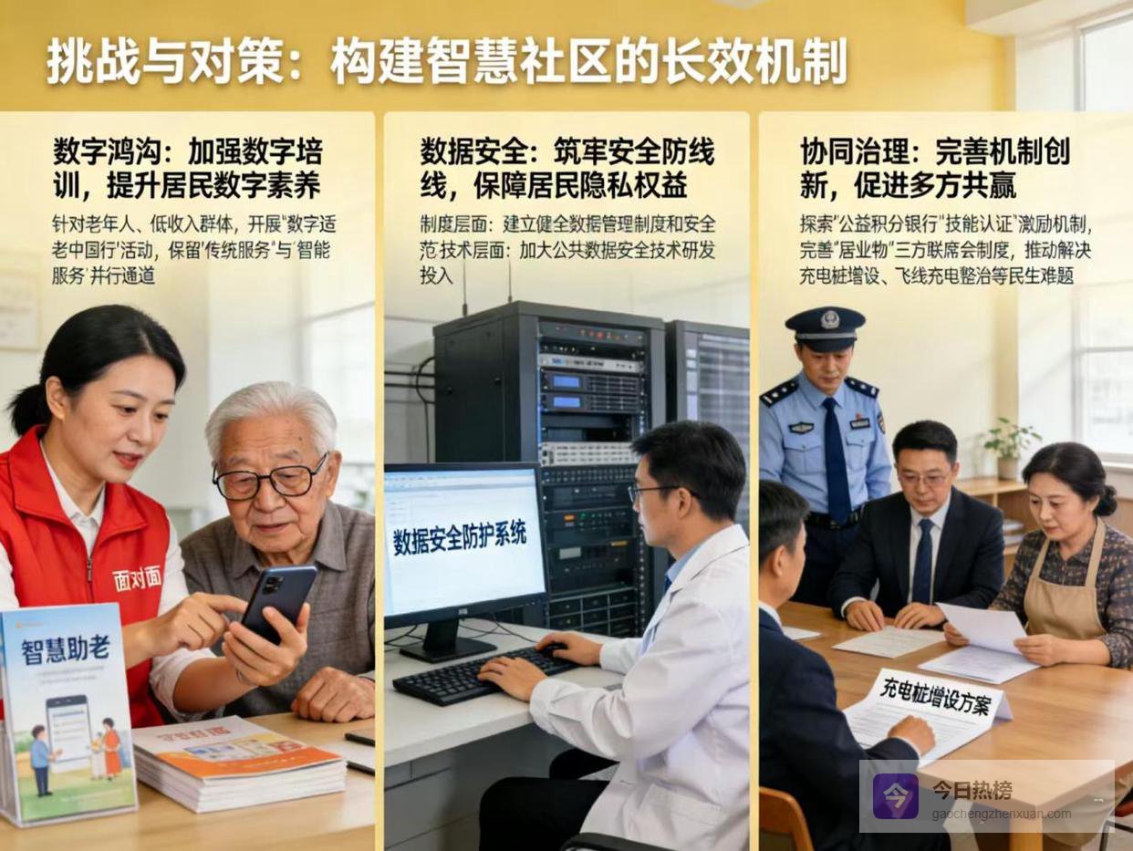 数字鸿沟是智慧社区建设面临的最大挑战之一。老年人、低收入群体等往往缺乏使用智能设备的能力和意愿。为解决这一问题,需要加强数字培训,提升居民的数字素养。例如,开展“智慧助老”行动、“数字适老中国行”活动等,通过“面对面”“一对一”的方式教老年人使用智能手机、智能设备;同时,优化服务方式,保留“传统服务”与“智能服务”并行通道,避免强制智能。