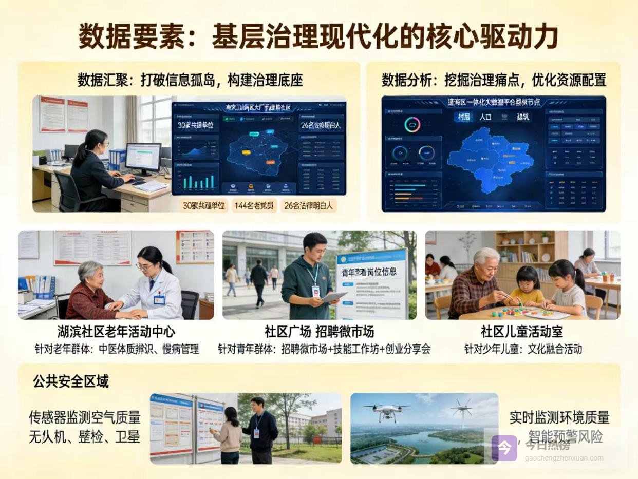 基层治理的难点在于信息分散、条块分割,导致资源难以高效配置。以南京江北新区大厂街道湖滨社区为例,该社区通过构建“党建引领+全龄赋能+内生造血”的治理模式,将30家共建单位、144名老党员、26名“法律明白人”纳入治理矩阵,实现了党组织覆盖无盲区、服务群众零距离。这一模式的核心在于数据汇聚——通过网格化管理,将社区内的人、事、地、物、情等数据全面归集,形成“底数清、情况明”的治理底座。