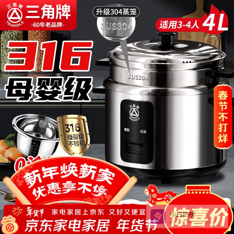 【京东自营】三角牌电饭锅老式电饭煲家用316不锈钢内胆4L煮饭锅3-4人米饭锅带蒸笼TG-Z40X1¥