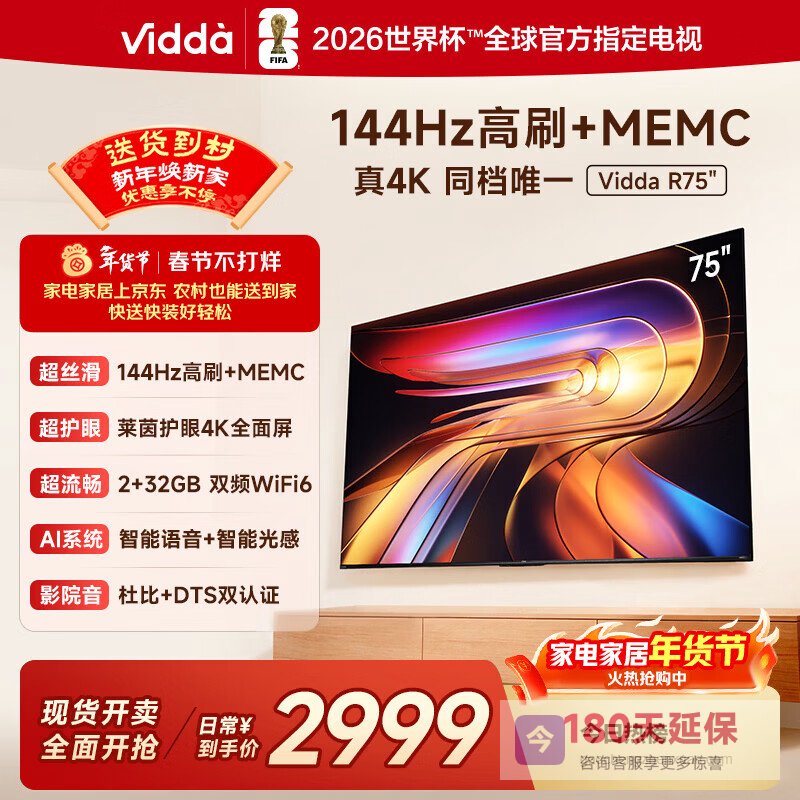 推荐理由:这款Vidda75V1Q-R电视的144Hz高刷新率,让画面流畅不卡顿,无论是游戏还是看电影都觉得特别顺畅,体验感很不错。配备4K HDR10,色彩鲜艳,自然过渡,画面细节很丰富,带来影院级的视觉享受。