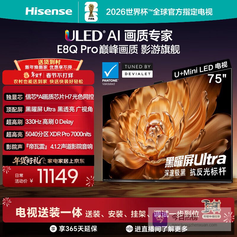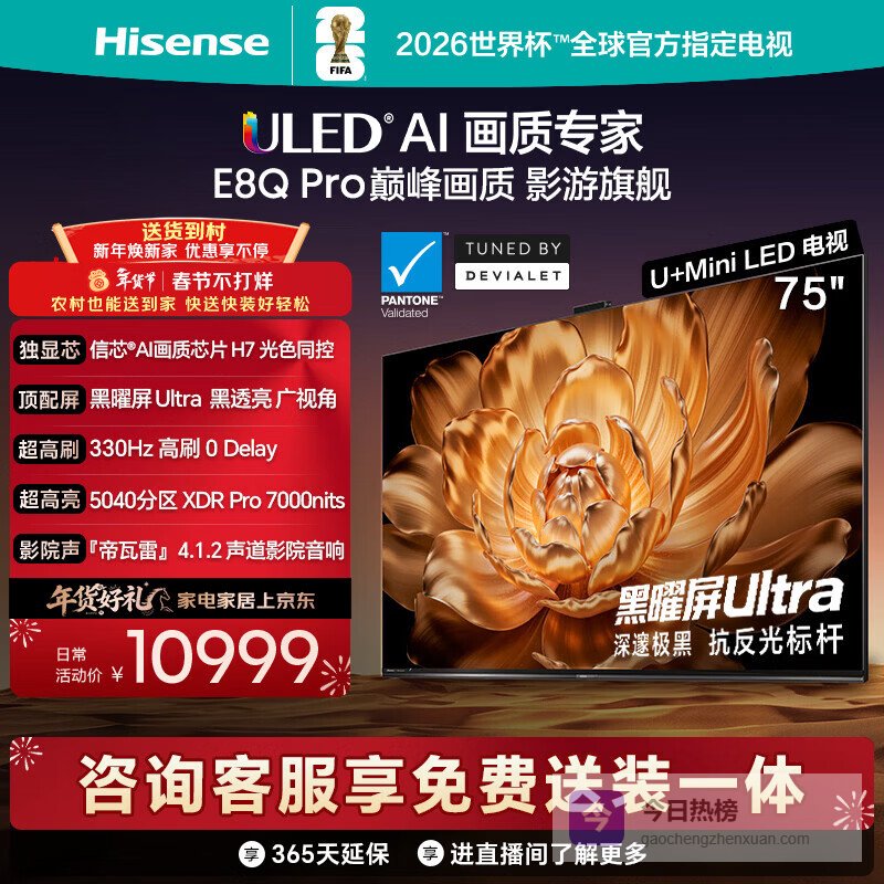 海信电视E8Q Pro 75英寸 信芯H7 5040分区U+MiniLED 黑曜屏Ultra 330Hz 国家补贴世界杯电视75E8Q-PRO¥