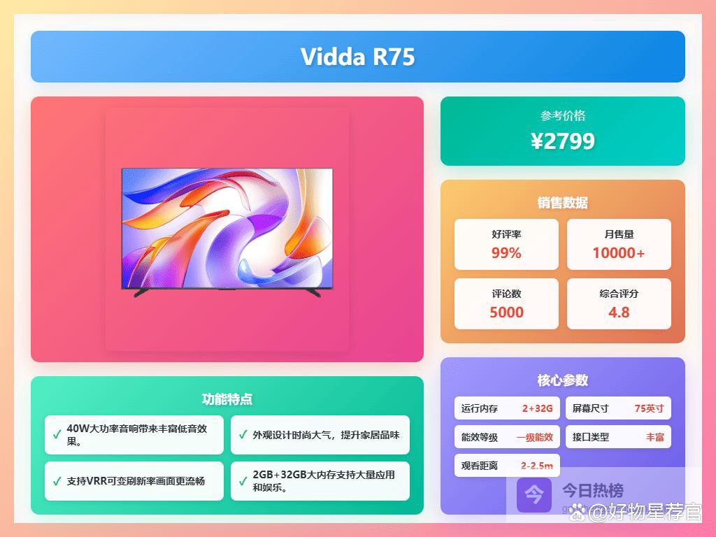 如果你平时追剧、看电影比较多,那我觉得可以侧重画质表现。像Mini LED背光的电视,比如海信E8Q Pro和海信75E8Q-PRO,画面色彩更鲜艳、对比度更高,看着就舒服。而且它们通常都有AI画质芯片加持,能自动优化画面,让你感觉更真实。当然啦,如果你对音质也有追求,那Vidda VX5Q这种带帝瓦雷调校音响的,绝对能给你带来更好的沉浸感。总的来说,根据自己的需求和预算,选择适合自己的才是王道!