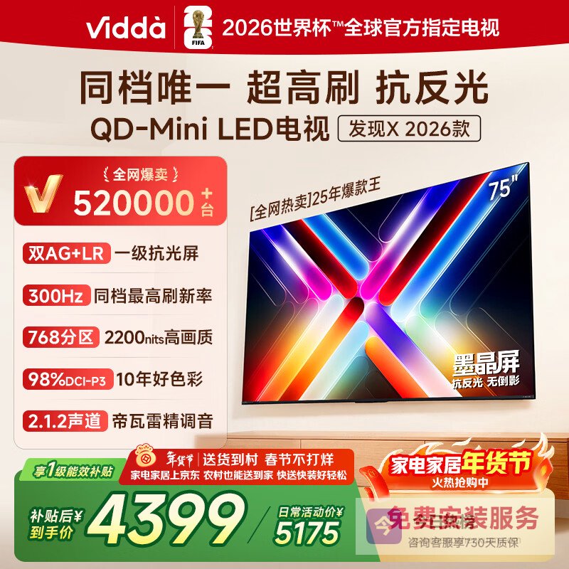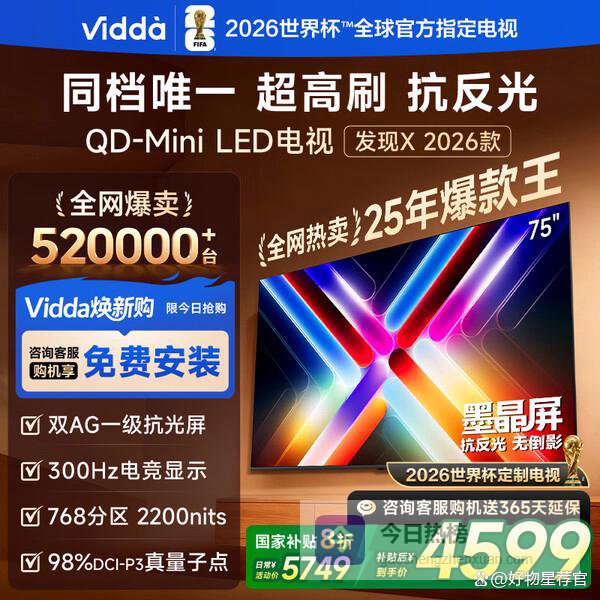 Vidda发现X 2026款 75英寸 300Hz超高刷 墨晶屏 QD-MiniLED 以旧换新家电国家补贴世界杯海信电视75VX5Q 75英寸¥