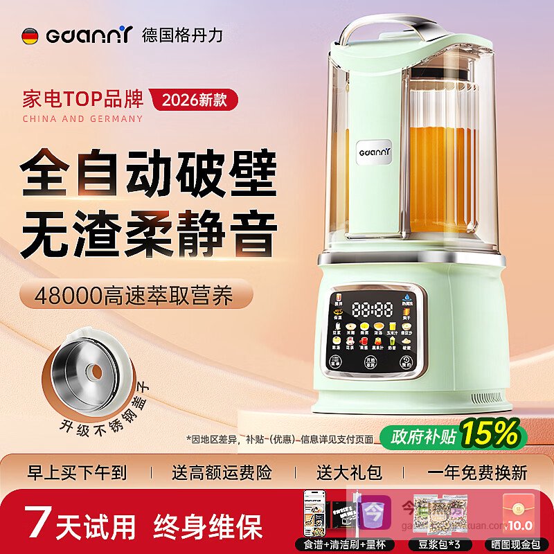 GDANNY德国破壁机全自动免煮2026新款静轻音豆浆机无渣家用自清洗五谷杂粮3-4人5用免洗6大容量榨汁小型2 绿色pro+【钛抗菌】2026升级款¥