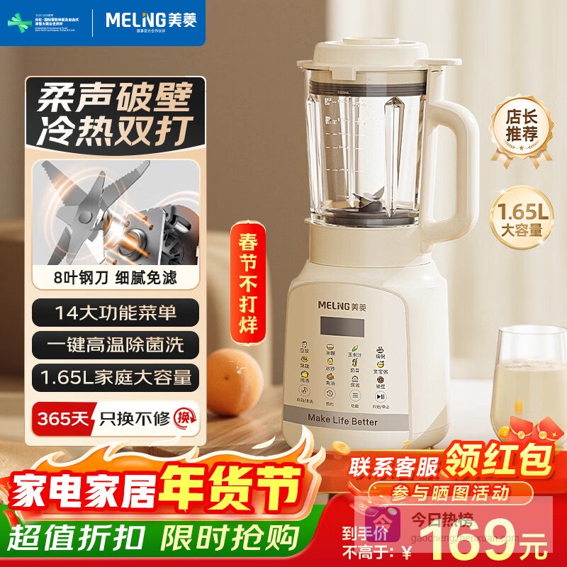美菱新款豆浆机家用厨房破壁免过滤多功能榨汁粗粮料理机米糊机五谷杂粮全自动一键清洗破壁机 14大功能+1.65L大容量MB-PW1501¥