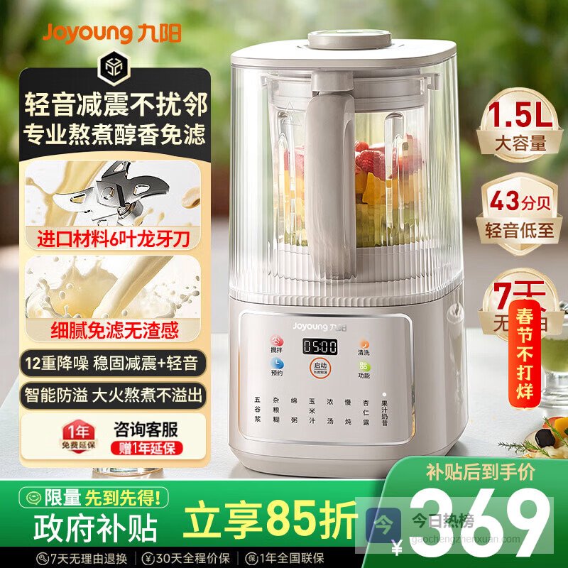 点评:这个苏泊尔1L低音破壁机,运行时噪音低至40.9分贝,用起来特别安静,早上打豆浆都不会吵醒家人,挺适合想享受静谧时光的你。采用高效的降噪设计和隔音罩,外界噪音几乎听不到,家里人用着更放心。