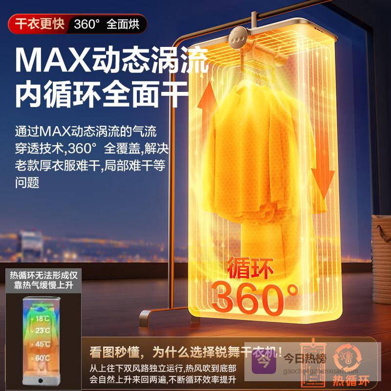 1️⃣高效烘干技术:独特的强对流设计让衣物在短时间内迅速干燥,薄衫仅需12分钟即可烘干。无论是潮湿的天气还是普通环境,都能从容应对,保持衣物随时洁净清新,这为忙碌的生活带来了极大的便利。
