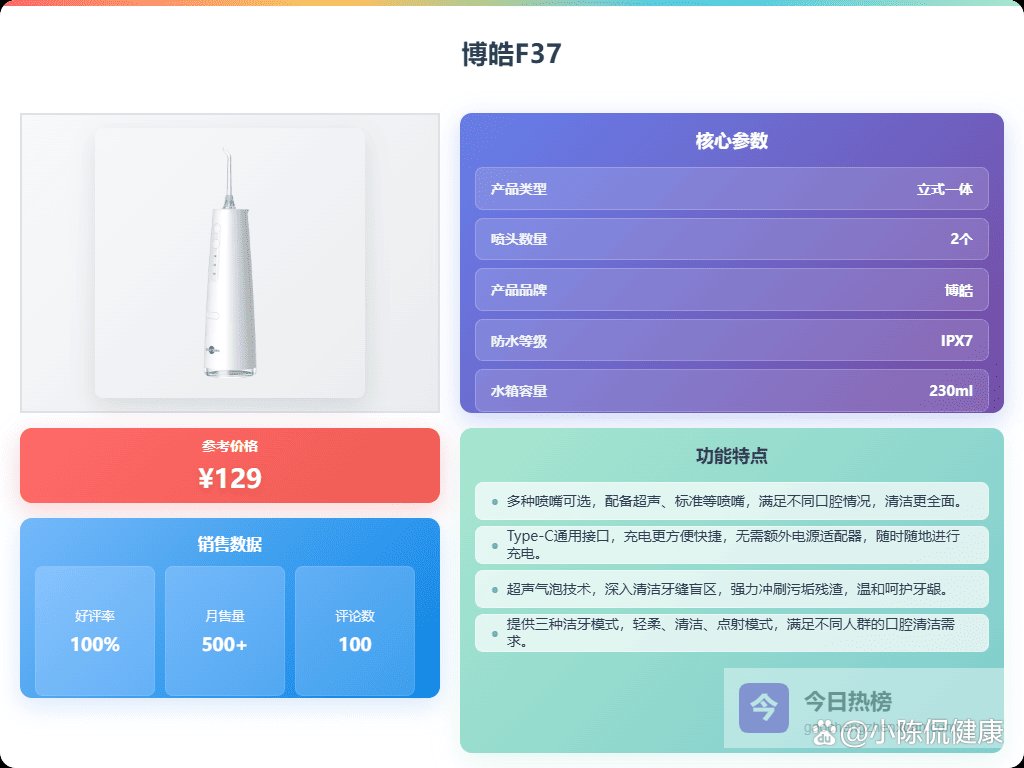 现在市面上做冲牙器的品牌挺多的,像博皓、拜尔、松下这些都挺常见的。价格方面,从一百多到几百不等,主要看功能和品牌。一般来说,大品牌的冲牙器在技术和售后服务上会更有保障一些,但价格也会相对贵一点。其实大家可以根据自己的预算和需求来选择,不一定非要追求最贵的。接下来,我们会结合上面说的这些选购要点,精选3款不同价位段、各有特色的冲牙器,给大家做个详细的对比和推荐。