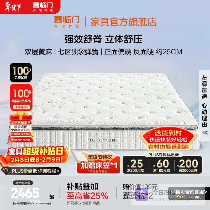 当你的需求升级,不再满足于单一的睡感,而是寻求一种“科学系统的睡眠解决方案”时,像喜临门这样的专业床具品牌推出的复合型床垫就值得重点关注了。这款“飞跃尊享3.0”堪称一个“睡眠系统”的缩影:上层是进口乳胶软垫,提供亲肤柔软的触感和贴合度;中层是环保黄麻硬垫,带来了清爽透气和稳固的支撑,尤其适合潮湿地区;底层则是核心的“七区独袋静音弹簧”,它能根据身体不同部位精准承托,有效减少伴侣间的翻身干扰。这种“软+硬+稳”的三明治结构,充分考虑到了人体工学和对不同睡眠需求的兼容性。对于夫妻、对睡眠质量有较高要求的家庭,或者纠结于“既想要包裹感又想要支撑力”的人来说,这类产品提供了“全都要”的可能性。