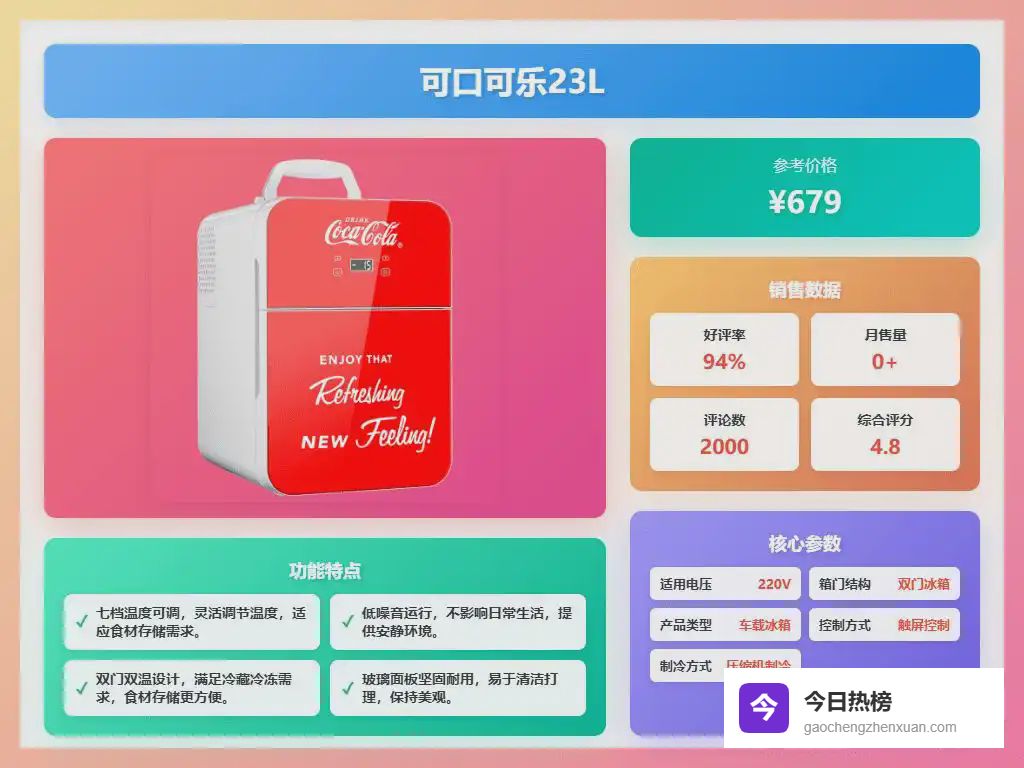 要说这可口可乐车载冰箱啊,选择的时候首先得看你的实际需求。你是经常自驾游,需要冷藏大量食物和饮料呢,还是平时就放几罐可乐解解渴?如果是前者,那肯定得选容量大一点的,最好是带冷冻功能的,像那种双开门的就不错,能冷藏能冷冻,啥都能放。但如果只是日常用,那就选个小巧轻便的,8L或者12L的就足够了,不占地方,用起来也方便。还有,看清是压缩机制冷还是半导体制冷,压缩机效果好,但价格也贵一些,半导体制冷便宜,但制冷效果相对弱一点,看你自己的预算和要求啦!