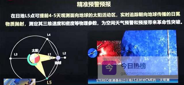 考虑到太阳自转和地球公转之间的角度关系,如果在太阳表面发生了某些现象,那么在5号拉格朗日点上,可以提前4到5天就观测到,但是在1号拉格朗日点上就只能提前几分钟。