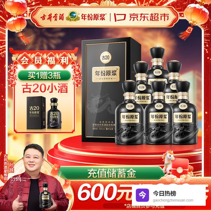市场价约550元,皖酒的“排面担当”,也是江淮派浓香的代表。古井贡酒古20用的是古井贡的传统窖池工艺,基酒年份足,口感醇厚,开瓶是浓郁的窖香和粮香,入口绵甜,中段香气饱满,尾段净爽,包装是暗红色的陶瓷瓶,搭配烫金花纹,精致又大气。