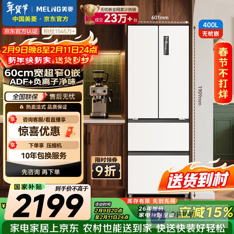 美菱无忧嵌400L法式多门冰箱小户型家用底部散热超薄窄门嵌入式一级能效变频BCD-400WP9CZX国家补贴¥