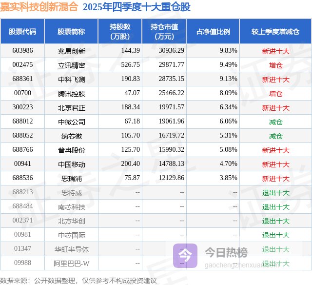 嘉实科技创新混合的前十大重仓股如下: