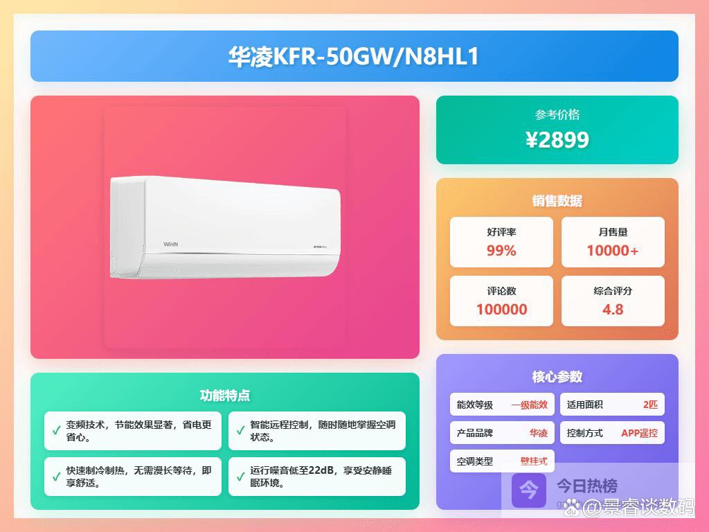 哪个品牌的挂机空调性价比高,高性价比品牌型号分享一、华凌这款华凌KFR-50GW/N8HL1空调,拥有变频技术,让你在享受快速制冷的同时还能省点电。它支持55℃高温制冷和-32℃低温制热,无论是酷暑还是严冬,都能稳定给你舒适温度。智能调节让它自己调节温度,忙碌的日子也不用担心调控问题。