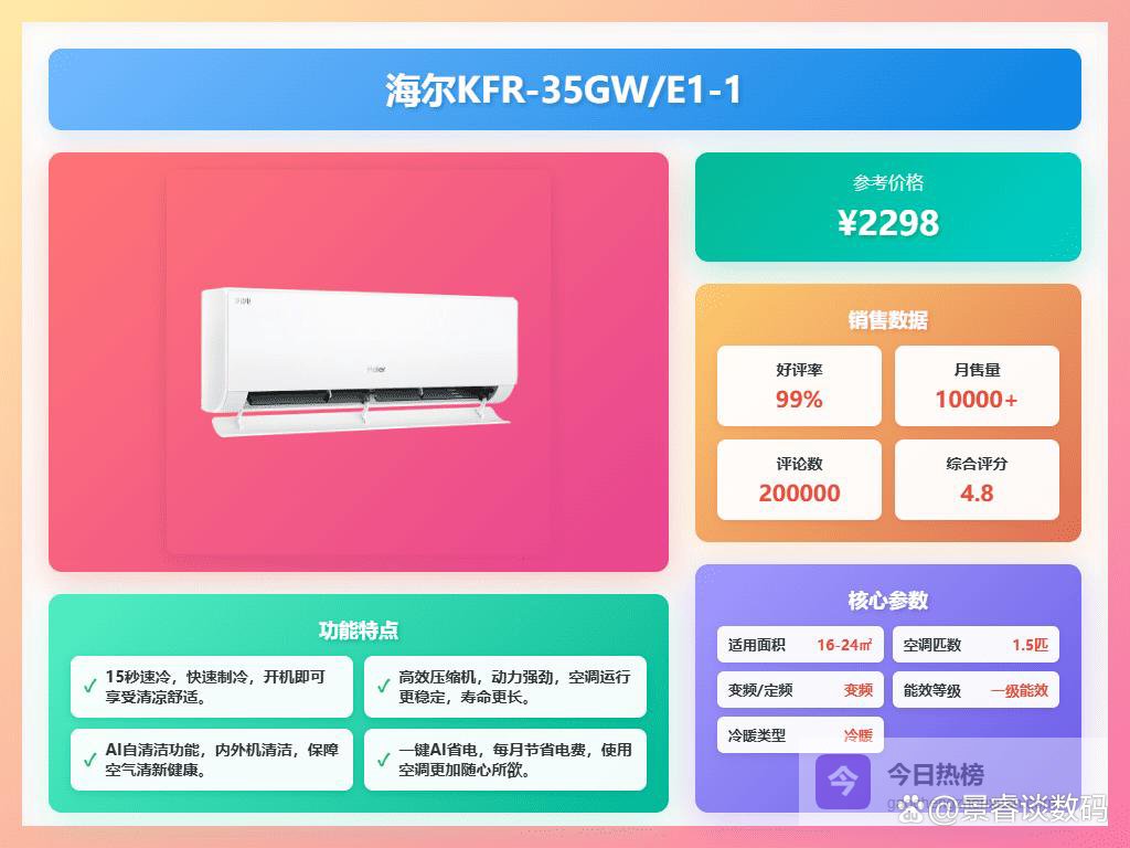 现在大家选空调都挺注重实用性,什么智能操控、自清洁功能这些都得有,当然最关键的还是制冷制热效果好,而且要省电才行。毕竟现在电费也不便宜,谁也不想夏天开空调,月底收到账单傻眼。像有些空调宣传的天花乱坠,实际用起来噪音大、温度不稳定,简直就是花钱买罪受。所以,空调这东西,还真得好好对比,选对了才能舒舒服服过日子。"推荐10款闭眼选,绝不踩坑!"可不是随便说说的,都是我认真筛选过的。接下来我整理了10款口碑还不错的挂机空调,大家可以看看。