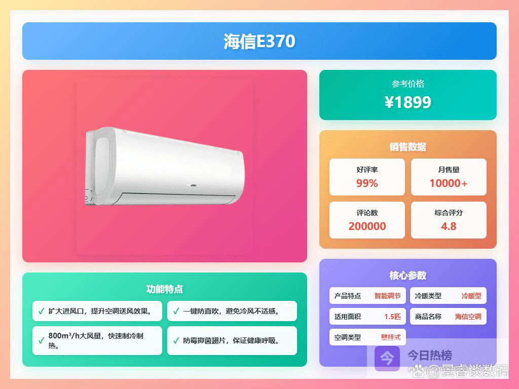 九、海信海信E370空调用智能调节让你跟天气赛跑,室温一升一降全靠它,既能省电又能确保你舒坦。试了下风向调节,风不直吹,大家都说舒服,没有那种被冷风“猛击”的感觉,好比有人温柔呵护你一样。还有自清洁功能,不用再担心机身积灰,保持出风口干净就像每天给空调洗澡,健康又省心。